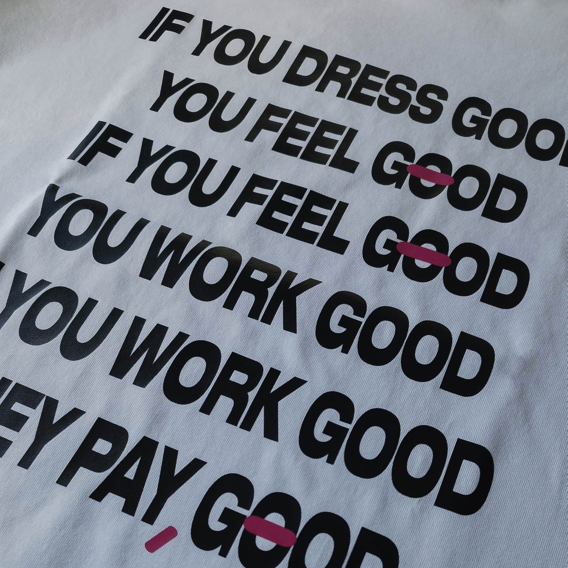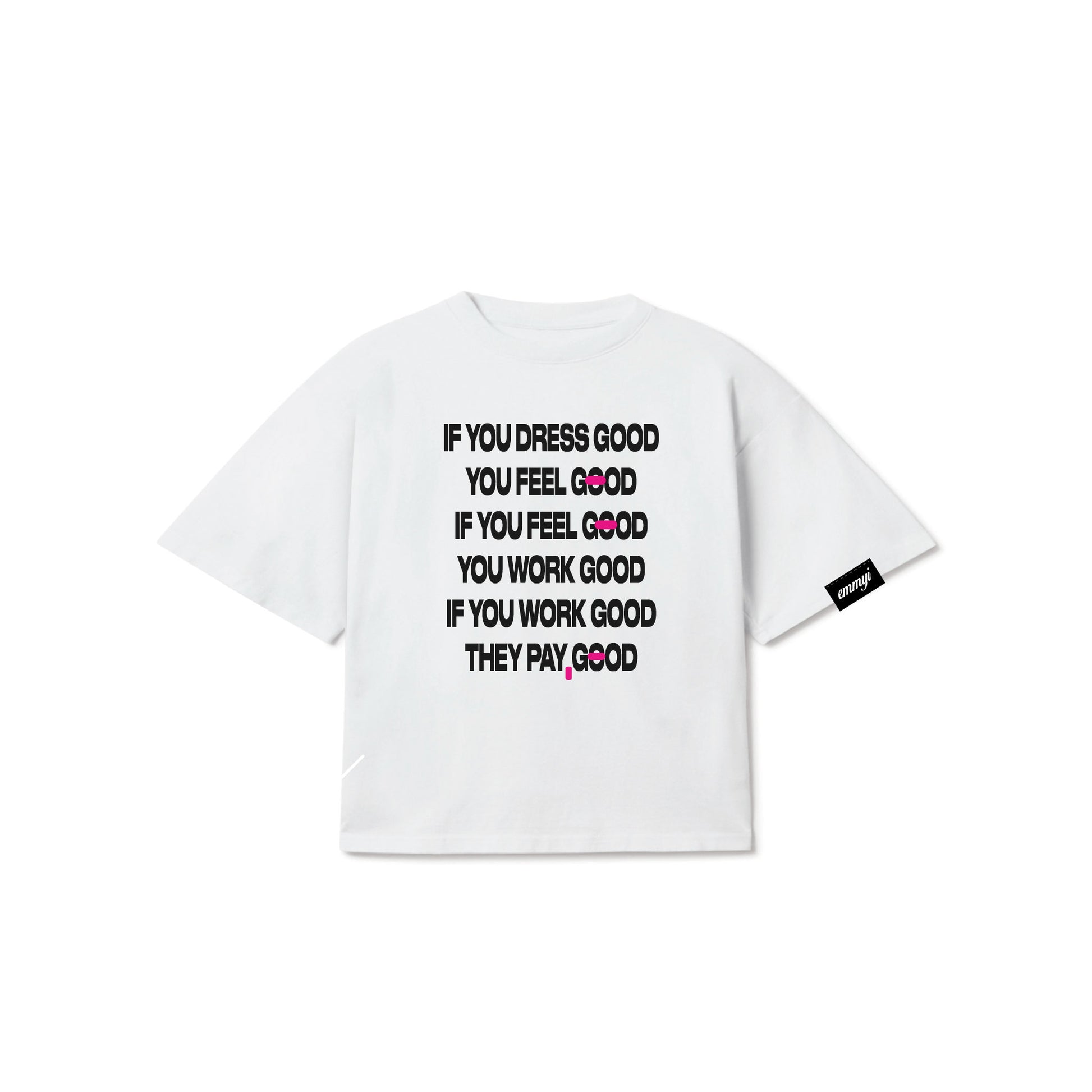 La camiseta "Look Good" es una prenda streetwear de diseño cropped oversize con cuello redondo, ajuste amplio, hombros caídos y corte desestresado en la cintura que captura la esencia del look urbano relajado.